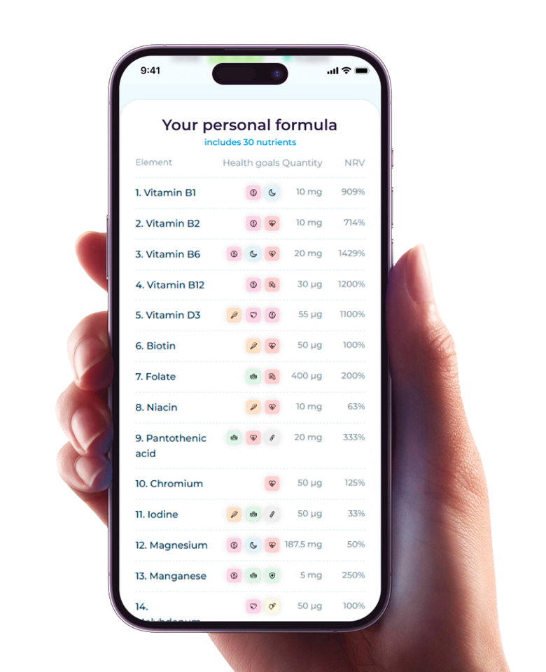 Your biomarkers are tested in accredited partner labs (CLIA/CAP) and run through our AI engine to identify exactly what you need.In the lab, your blood data is run through our AI engine (trained on 70 billion parameters) alongside clinical expert review. This powerful combination pinpoints exactly which nutrients you’re lacking and what your body needs to perform at its best. We don’t rely on hunches – we use hard data from your body.